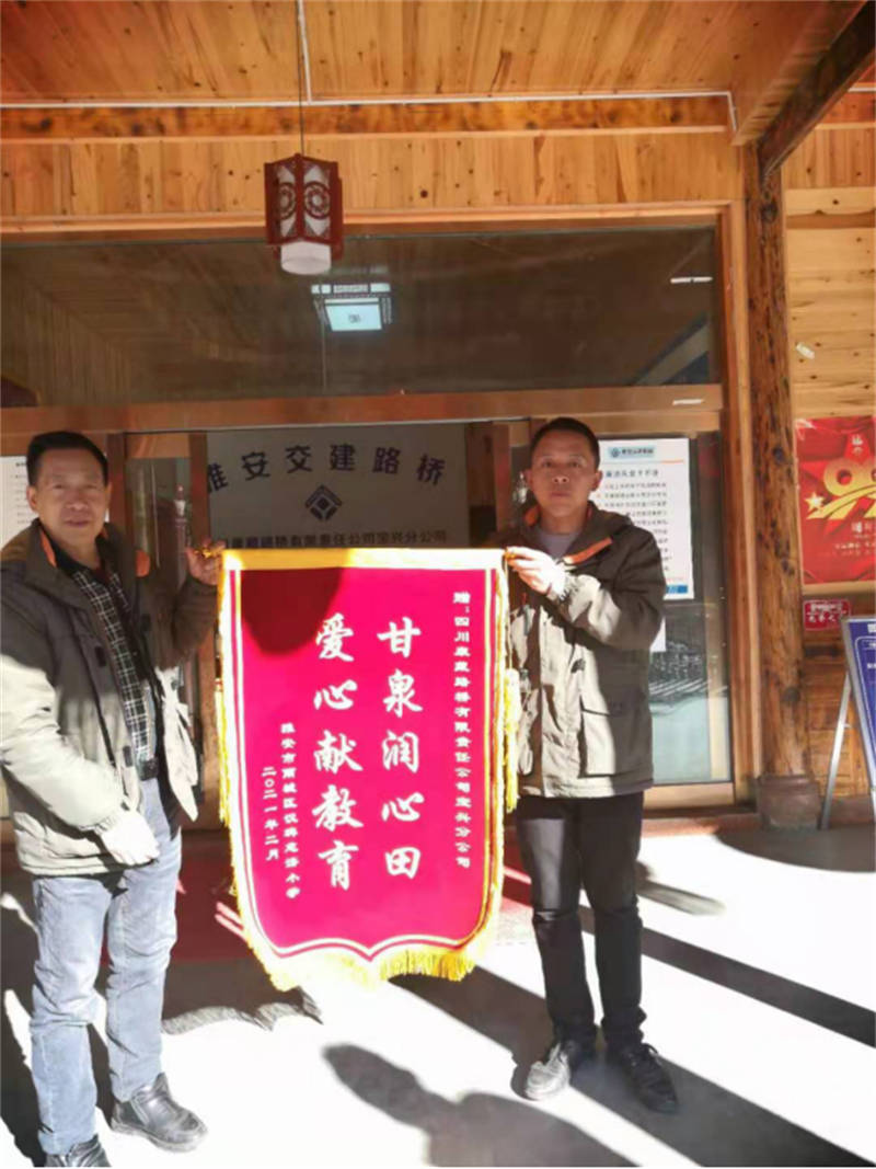 2月19日,雅安市雨城區(qū)第四小學(xué)漢碑校區(qū)將一面繡有“甘泉潤(rùn)心田、愛心獻(xiàn)教育 ”的錦旗送到交建路橋公司寶興項(xiàng)目部,感謝路橋公司向漢碑校區(qū)捐贈(zèng)5萬元基金用以建設(shè)該校勞動(dòng)教育烹飪基地。