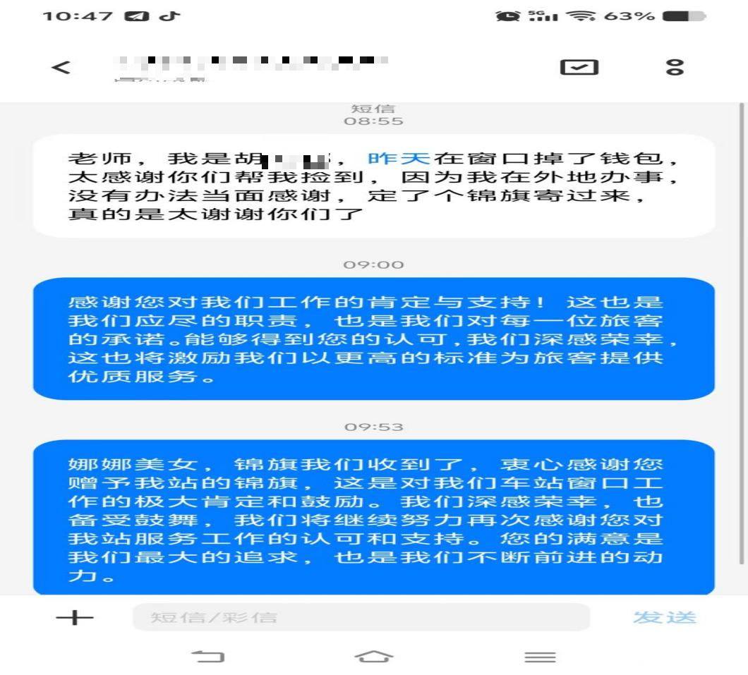 5月14日11時11分,售票員郝凌云發(fā)現(xiàn)柜臺上遺留了一個卡包,內(nèi)有現(xiàn)金 300 元、多張銀行卡、身份證及社保卡等重要物品。郝凌云第一時間上報值班科長,通過站務(wù)系統(tǒng)比對購票信息,僅用5分鐘便鎖定失主為即將前往漢源的旅客胡女士,此時胡女士正在等待檢票,尚未察覺錢包丟失。值班站長通過廣播系統(tǒng)緊急尋人,胡女士聽到廣播后立即前往值班室認(rèn)領(lǐng)物品,經(jīng)值班科長仔細(xì)核對身份及物品信息后,將卡包完好歸還。胡女士激動致謝:“太感謝你了!你們汽車站的工作人員素質(zhì)真高,太讓人暖心了!”