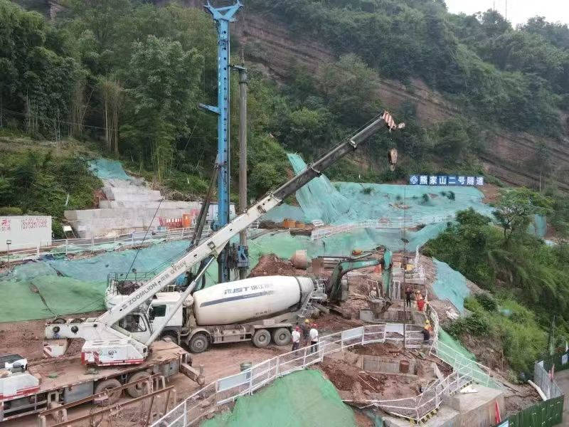 “咚咚咚……”在雨城區(qū)多營鎮(zhèn)五營村熊家山二號隧道出口端空地上,旋挖鉆機開足馬力,朝著地層深處掘進,不斷發(fā)出富有節(jié)奏的聲響!懊總樁基有二十多米深!眹318線名山區(qū)黑竹(成都界)至雨城區(qū)多營段改建工程項目副經(jīng)理林洲,每天都要到各施工點位查看進度。他說,熊家山二號隧道附近山體為順層帶,易產(chǎn)生滑坡,進洞施工前需要先在洞外打抗滑樁,以確保施工安全,目前還在開展剩下3根抗滑樁的施工。
