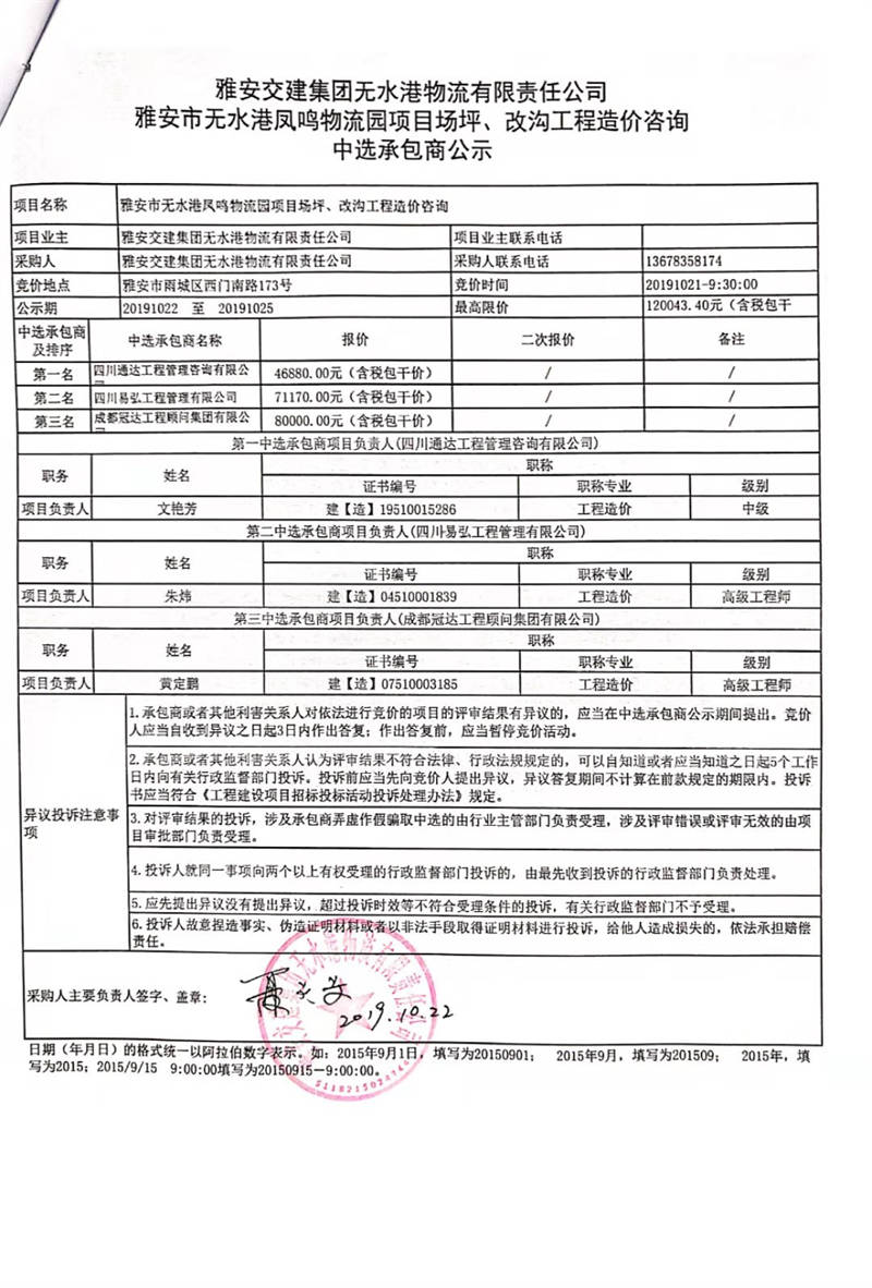 雅安交建集團(tuán)無(wú)水港物流有限責(zé)任公司雅安市無(wú)水港鳳鳴物流園項(xiàng)目場(chǎng)坪、改溝工程造價(jià)咨詢(xún)中選承包商公示