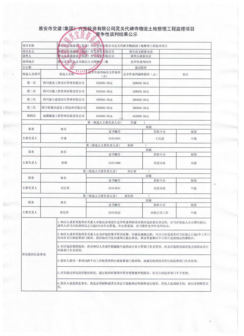 雅安交建集團(tuán)興寶投資有限公司寶興縣靈關(guān)代碑寺物流園土地整理工程監(jiān)理項(xiàng)目競爭性談判結(jié)果公示