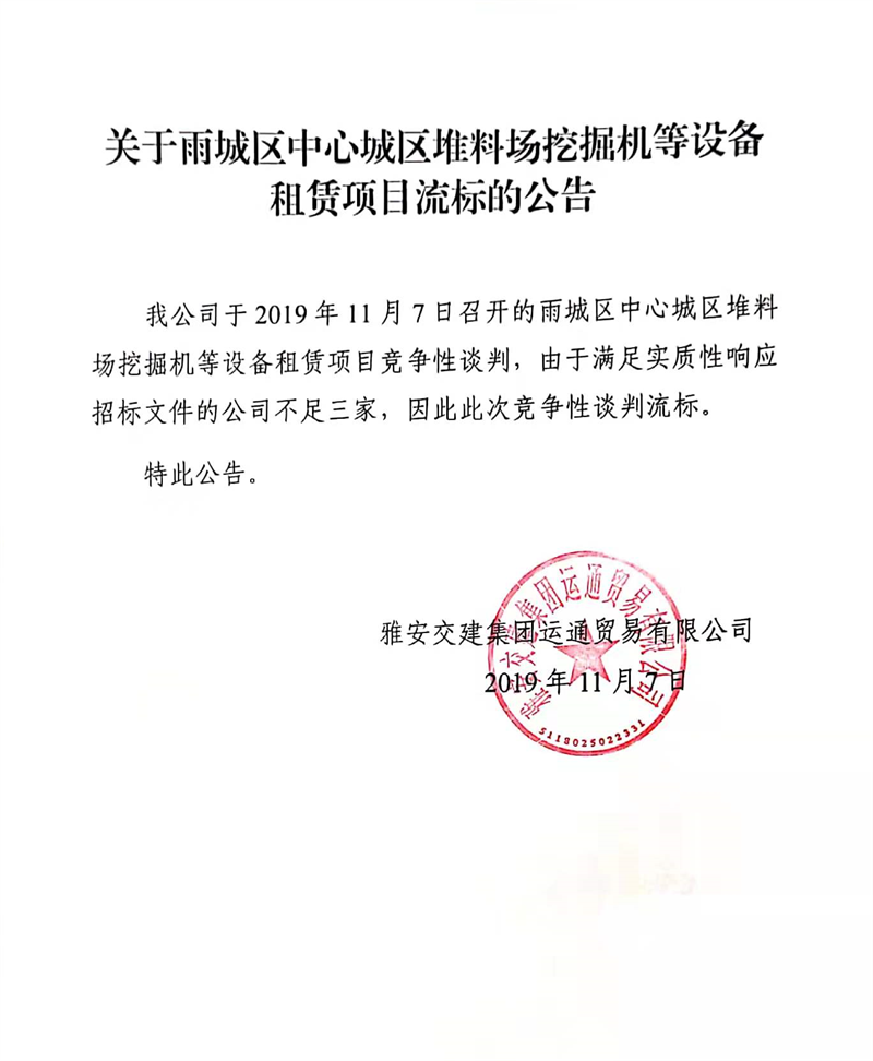 雅安交建集團(tuán)運通貿(mào)易有限公司關(guān)于雨城區(qū)中心城區(qū)堆料場挖掘機等設(shè)備租賃項目流標(biāo)的公告