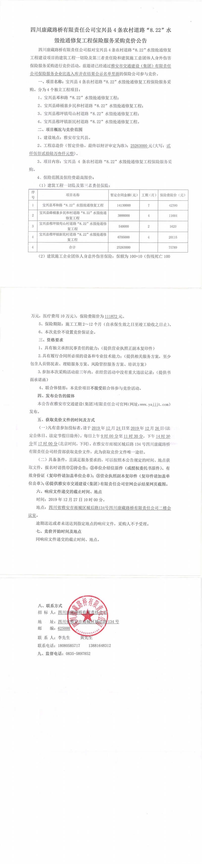 四川康藏路橋有限責(zé)任公司寶興縣4條農(nóng)村道路“8.22”水毀搶通修復(fù)工程保險(xiǎn)服務(wù)采購(gòu)競(jìng)價(jià)公告