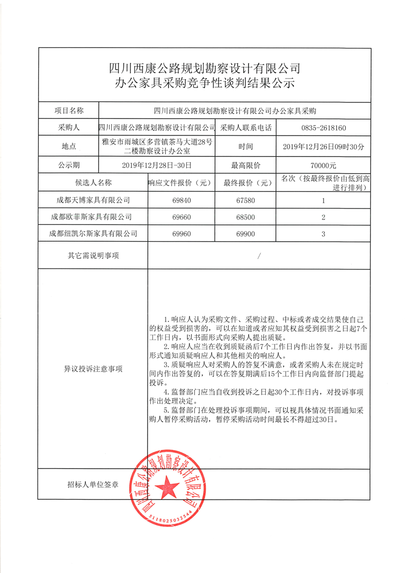 四川西康公路規(guī)劃勘察設計有限公司辦公家具采購競爭性談判結(jié)果公示