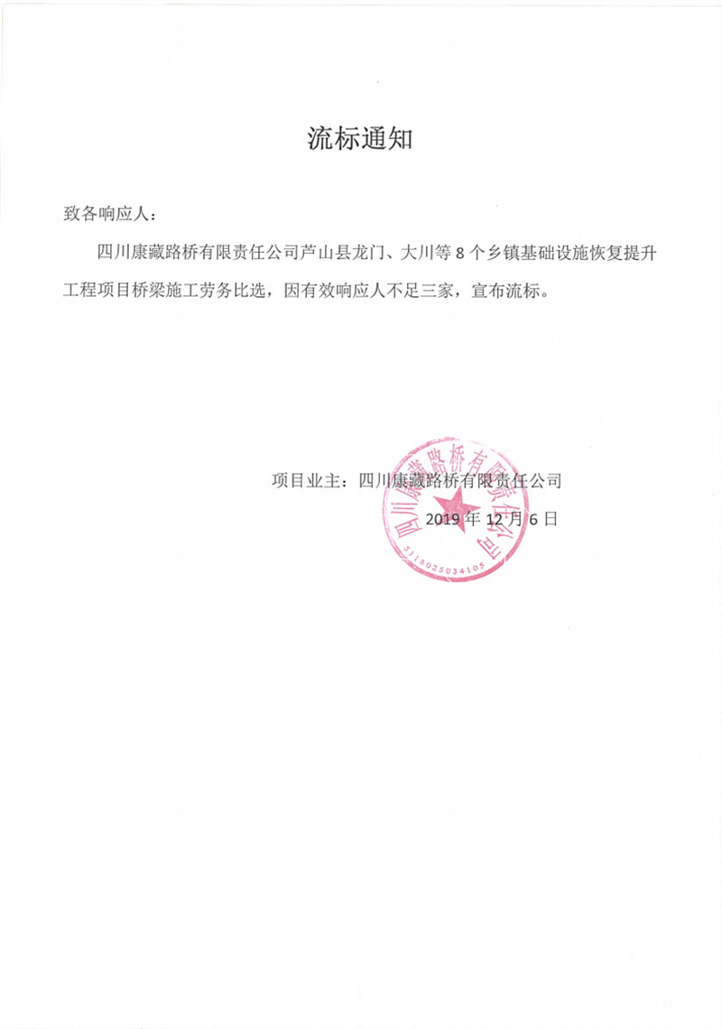 四川康藏路橋有限責任公司蘆山縣龍門、大川等8個鄉(xiāng)鎮(zhèn)基礎(chǔ)設施恢復提升工程項目橋梁施工勞務比選流標通知