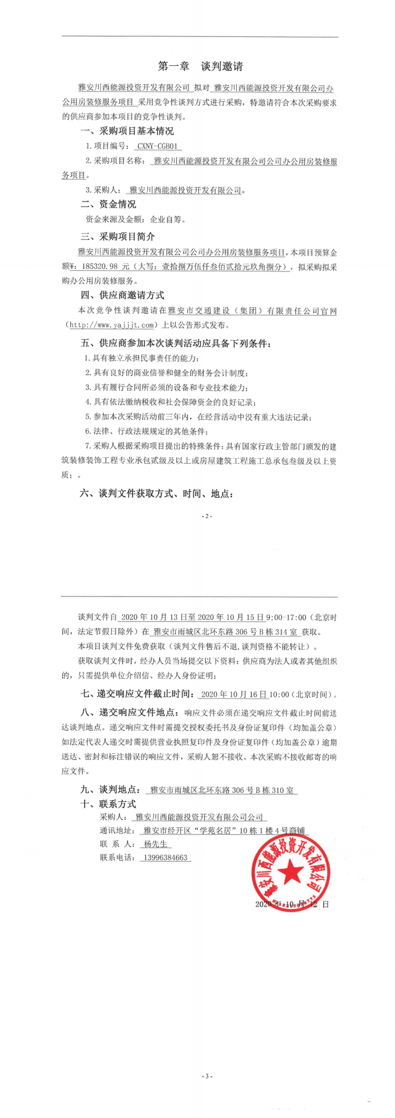 雅安川西能源投資開發(fā)有限公司辦公用房裝修服務(wù)項(xiàng)目競(jìng)爭(zhēng)性談判公告