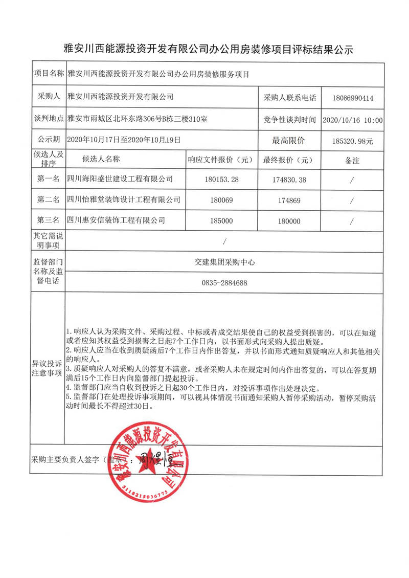 雅安川西能源投資開發(fā)有限公司辦公用房裝修項目評標(biāo)結(jié)果公示