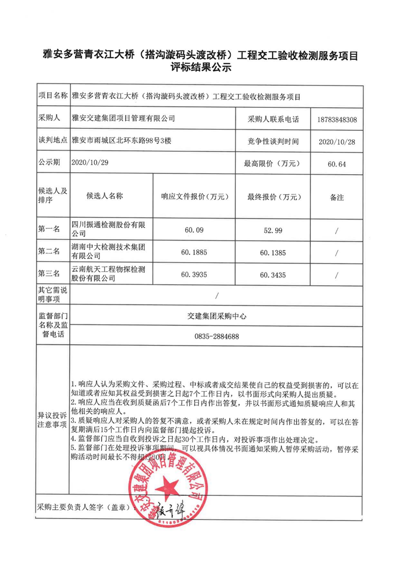 雅安交建集團項目管理有限公司雅安多營青衣江大橋(搭溝漩碼頭渡改橋)工程交工驗收檢測服務項目評標結(jié)果公示