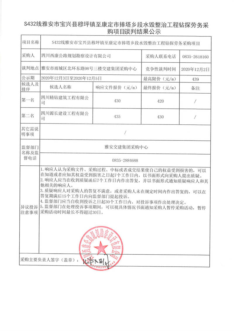 四川西康公路規(guī)劃勘察設(shè)計有限公司S432線雅安市寶興縣穆坪鎮(zhèn)至康定市捧塔鄉(xiāng)段水毀整治工程鉆探勞務(wù)采購項目談判結(jié)果公示