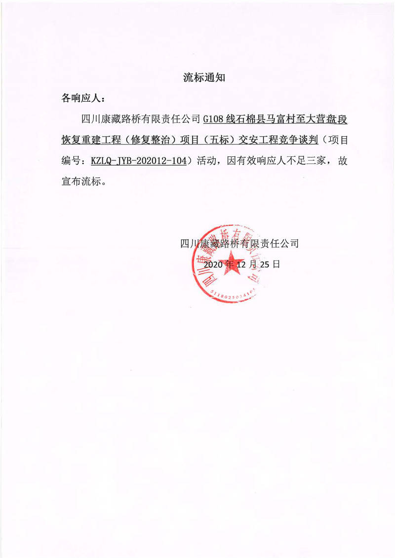 四川康藏路橋有限責(zé)任公司G108線石棉縣馬富村至大營盤段恢復(fù)重建工程(修復(fù)整治)項(xiàng)目(五標(biāo))交安工程流標(biāo)通知