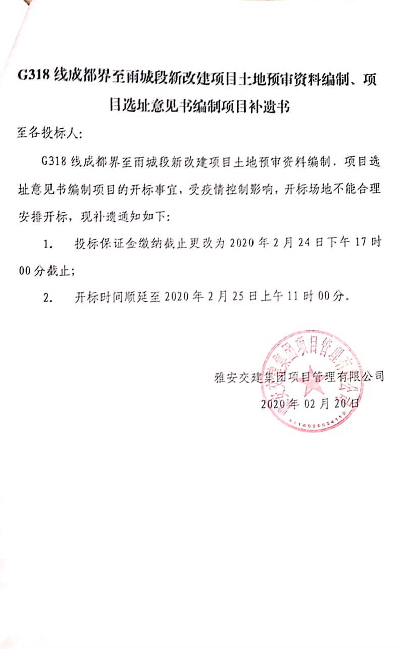 雅安交建集團(tuán)項目管理有限公司G318線成都界至雨城段新改建項目土地預(yù)審資料編制、項目選址意見書編制項目補遺書