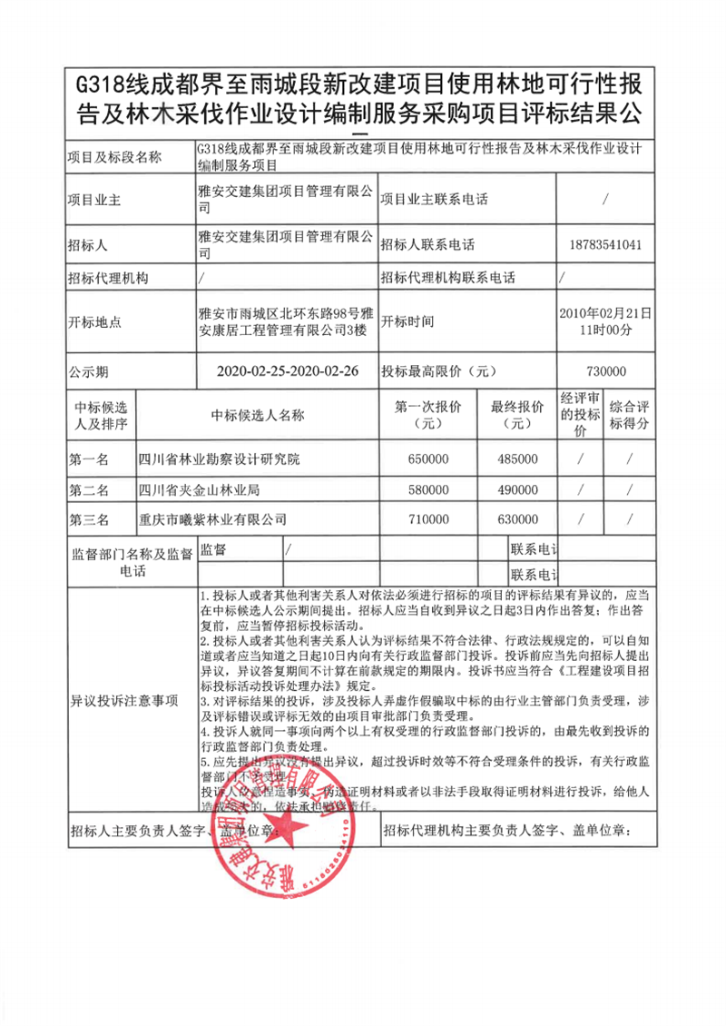 雅安交建集團(tuán)項(xiàng)目管理有限公司G318線成都界至雨城段新改建項(xiàng)目使用林地可行性報(bào)告及林木采伐作業(yè)設(shè)計(jì)編制服務(wù)采購項(xiàng)目評標(biāo)結(jié)果公示