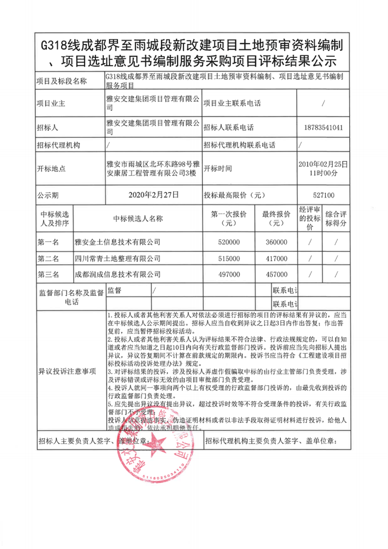 雅安交建集團(tuán)項(xiàng)目管理有限公司G318線成都界至雨城段新改建項(xiàng)目土地預(yù)審資料編制、項(xiàng)目選址意見書編制服務(wù)采購項(xiàng)目評(píng)標(biāo)結(jié)果公示