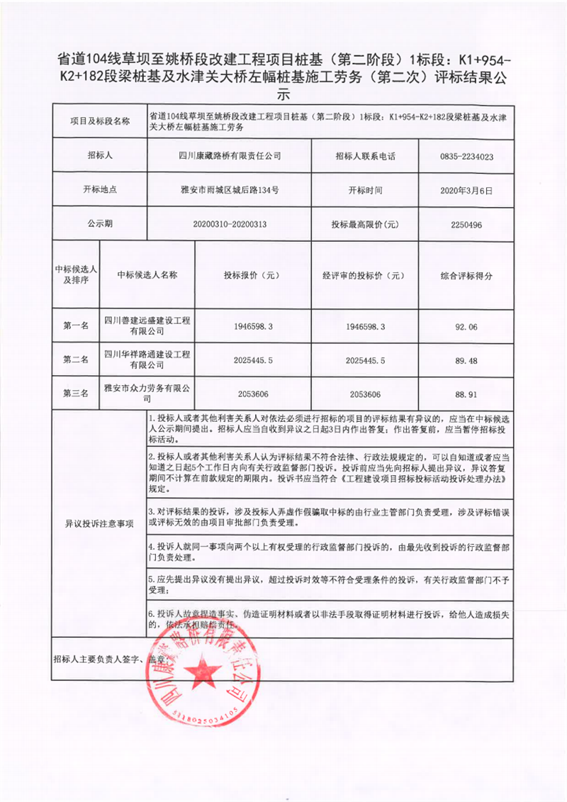 四川康藏路橋有限責(zé)任公司省道104線草壩至姚橋段改建工程項目樁基(第二階段)1標(biāo)段:K1+954-K2+182段梁樁基及水津關(guān)大橋左幅樁基施工勞務(wù)(第二次)評標(biāo)結(jié)果公示