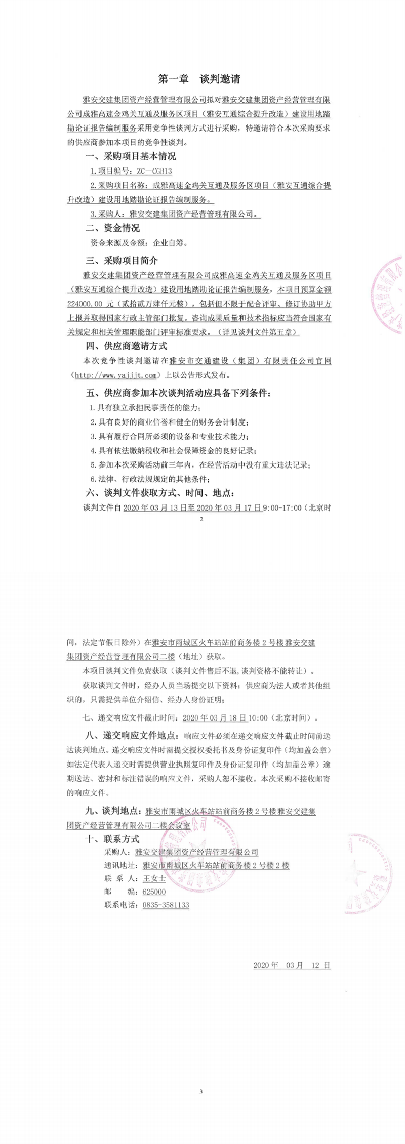 雅安交建集團(tuán)資產(chǎn)經(jīng)營管理有限公司成雅高速金雞關(guān)互通及服務(wù)區(qū)項(xiàng)目(雅安互通綜合提升改造)建設(shè)用地踏勘論證報告編制服務(wù)競爭性談判公告