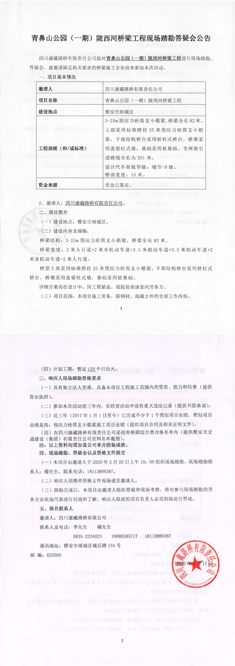 四川康藏路橋有限責任公司青鼻山公園(一期)隴西河橋梁工程現(xiàn)場踏勘答疑會公告