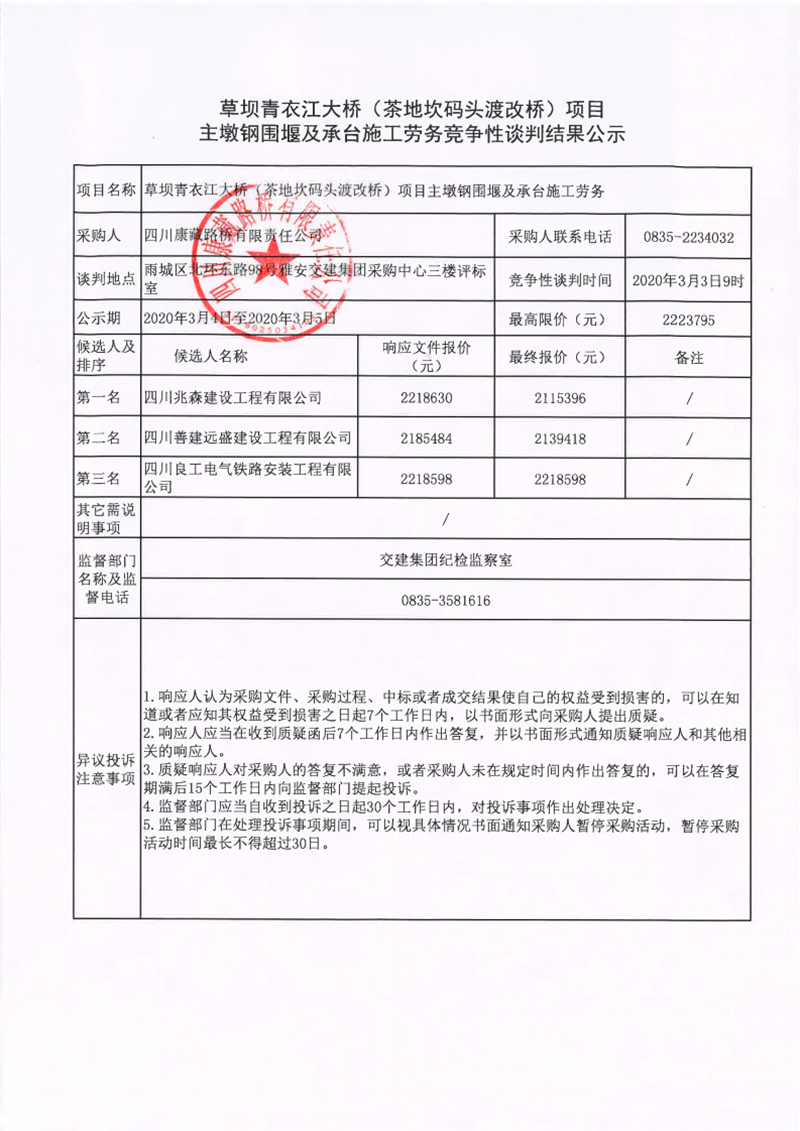 四川康藏路橋有限責(zé)任公司草壩青衣江大橋(茶地坎碼頭渡改橋)項(xiàng)目主墩鋼圍堰及承臺施工勞務(wù)競爭性談判結(jié)果公示