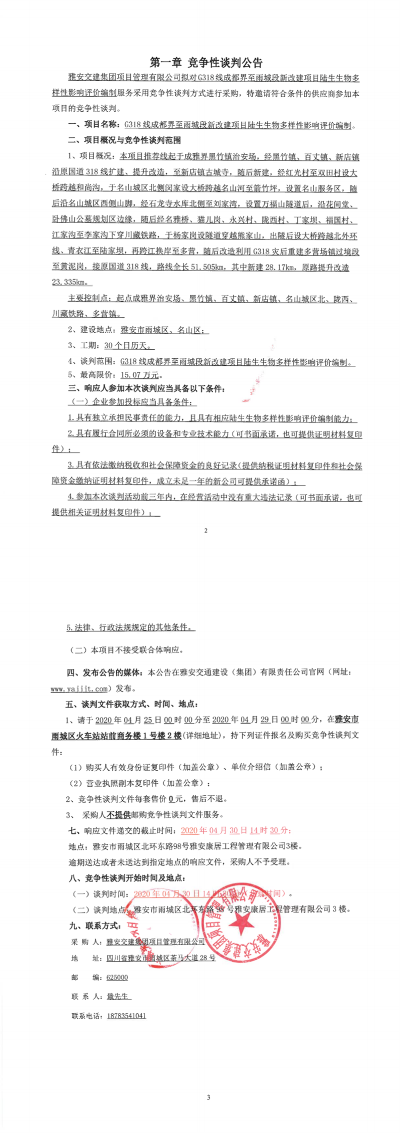 雅安交建集團(tuán)項(xiàng)目管理有限公司G318線(xiàn)成都界至雨城段新改建項(xiàng)目陸生生物多樣性影響評(píng)價(jià)編制競(jìng)爭(zhēng)性談判公告
