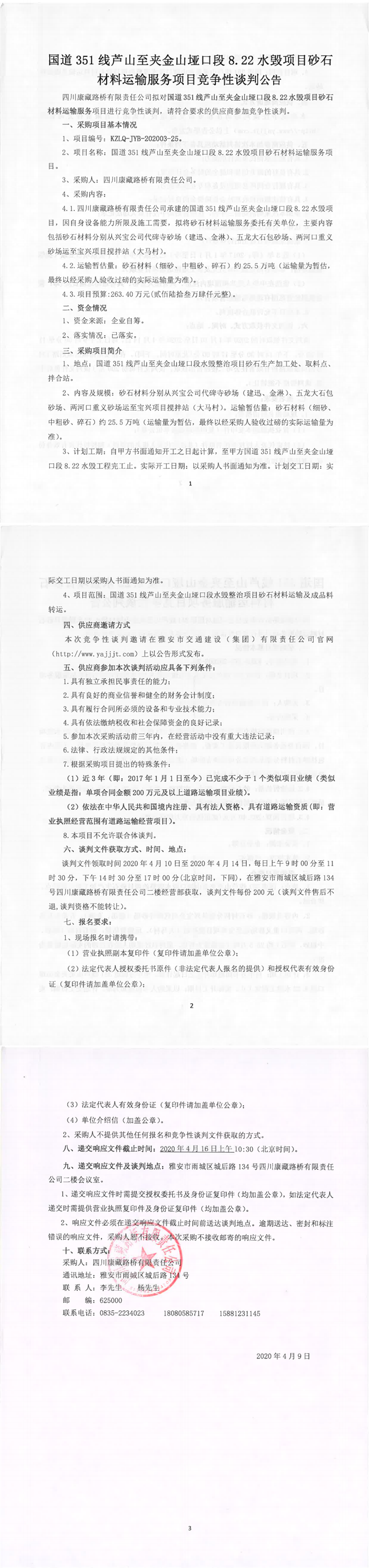 四川康藏路橋有限責(zé)任公司國(guó)道351線(xiàn)蘆山至夾金山埡口8.22水毀項(xiàng)目砂石材料運(yùn)輸服務(wù)項(xiàng)目競(jìng)爭(zhēng)性談判公告