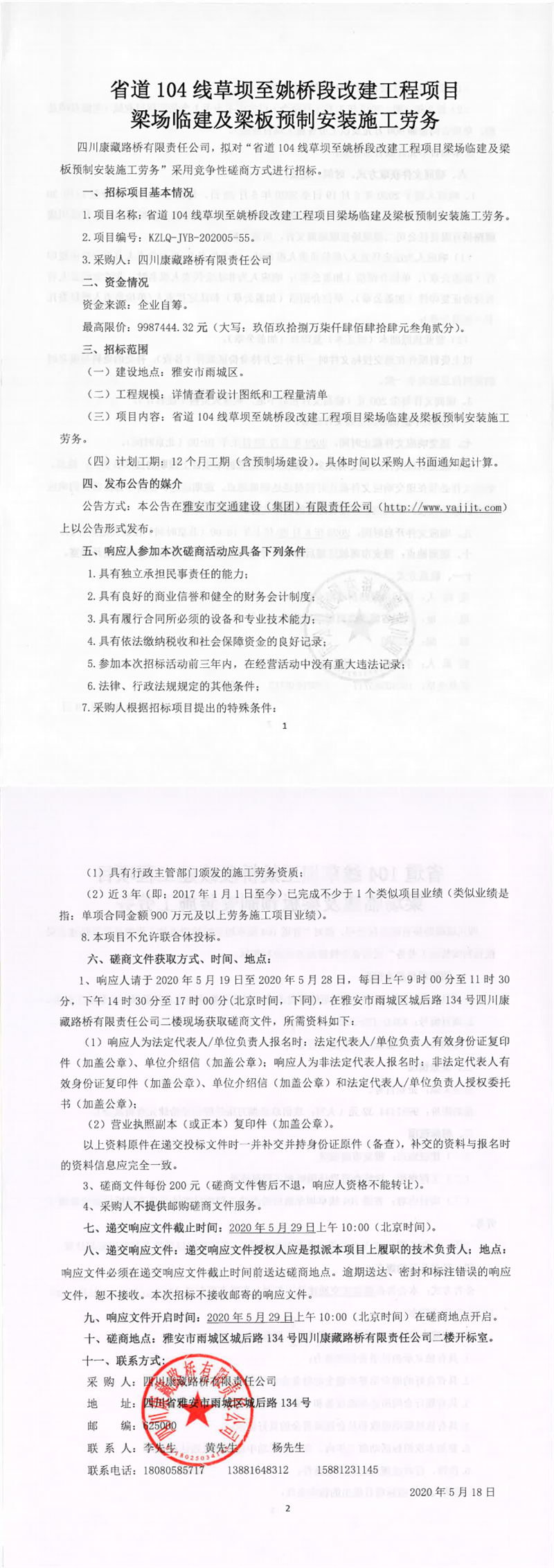 四川康藏路橋有限責任公司省道104線草壩至姚橋段改建工程項目梁場臨建及梁板預制安裝施工勞務競爭性磋商公告