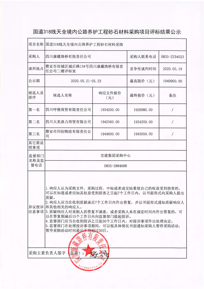 四川康藏路橋有限責(zé)任公司國道318線天全境內(nèi)公路養(yǎng)護(hù)工程砂石材料采購項目評標(biāo)結(jié)果公示