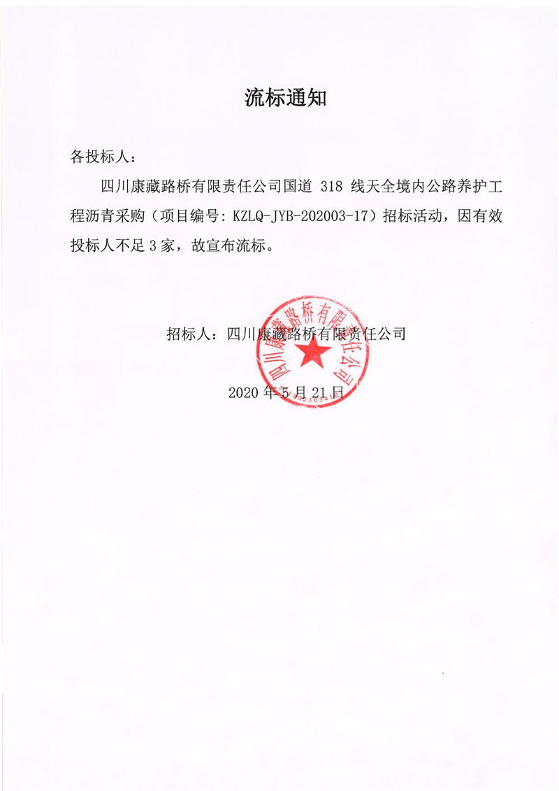 四川康藏路橋有限責(zé)任公司國道318線天全境內(nèi)公路養(yǎng)護工程瀝青采購項目流標(biāo)通知