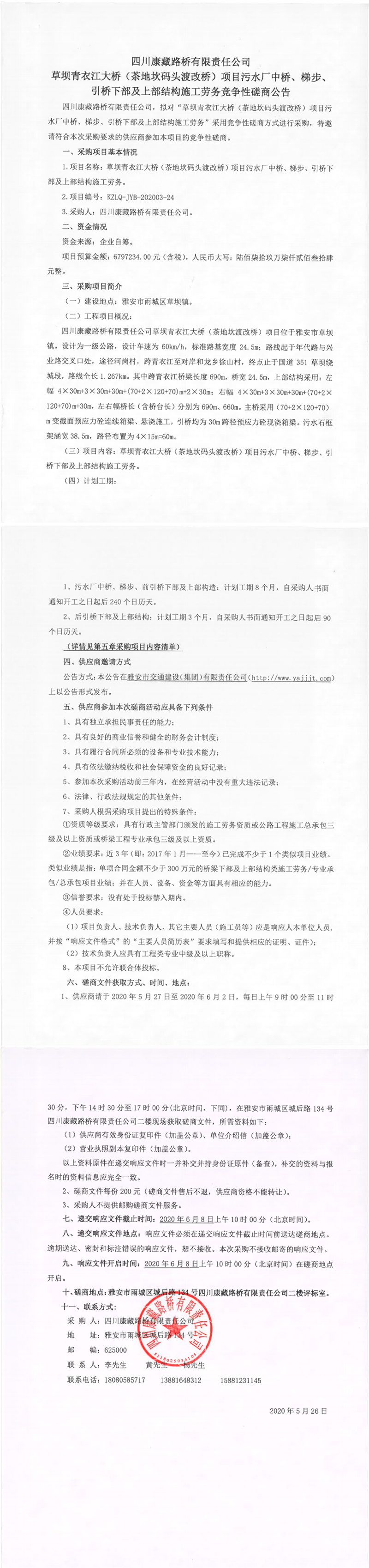 四川康藏路橋有限責(zé)任公司草壩青衣江大橋(茶地坎碼頭渡改橋)項(xiàng)目污水廠中橋、梯步、引橋下部及上部結(jié)構(gòu)施工勞務(wù)競(jìng)爭(zhēng)性磋商公告