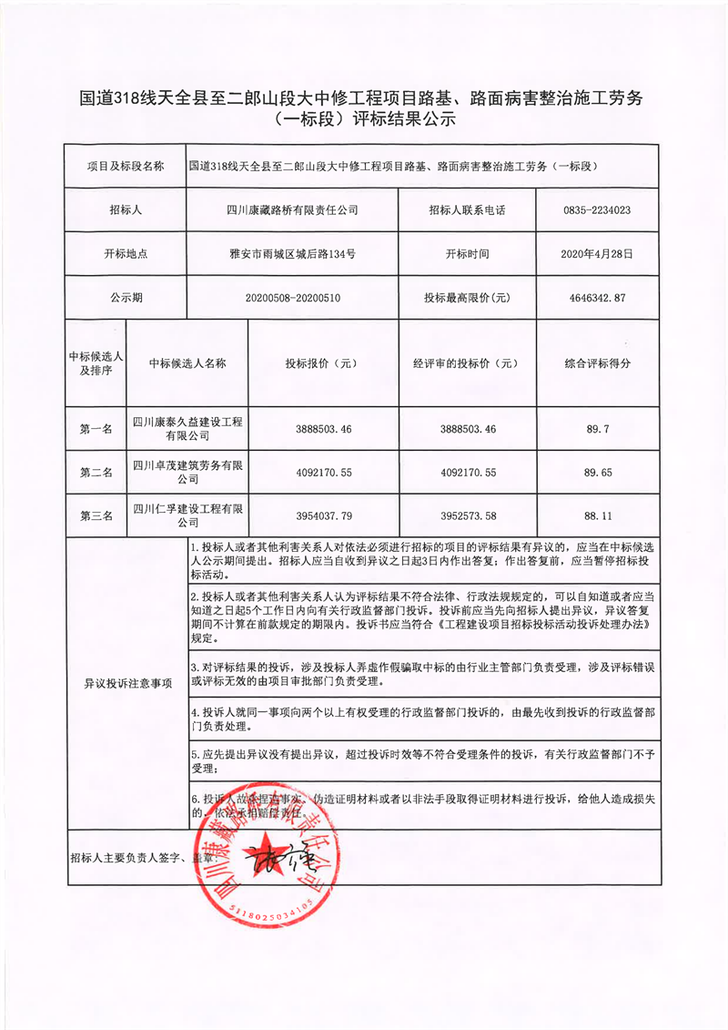 四川康藏路橋有限責(zé)任公司國道318線天全縣至二郎山段大中修工程項(xiàng)目路基、路面病害整治施工勞務(wù)(一標(biāo)段)評(píng)標(biāo)結(jié)果公示