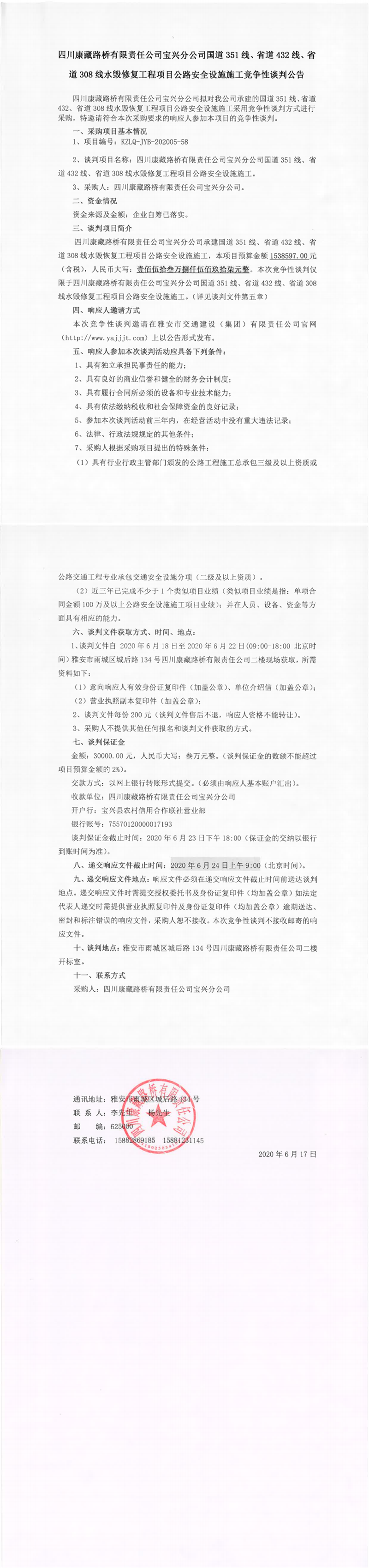 四川康藏路橋有限責(zé)任公司寶興分公司國(guó)道351線(xiàn)、省道432線(xiàn)、省道308線(xiàn)水毀修復(fù)工程項(xiàng)目公路安全設(shè)施施工競(jìng)爭(zhēng)性談判公告