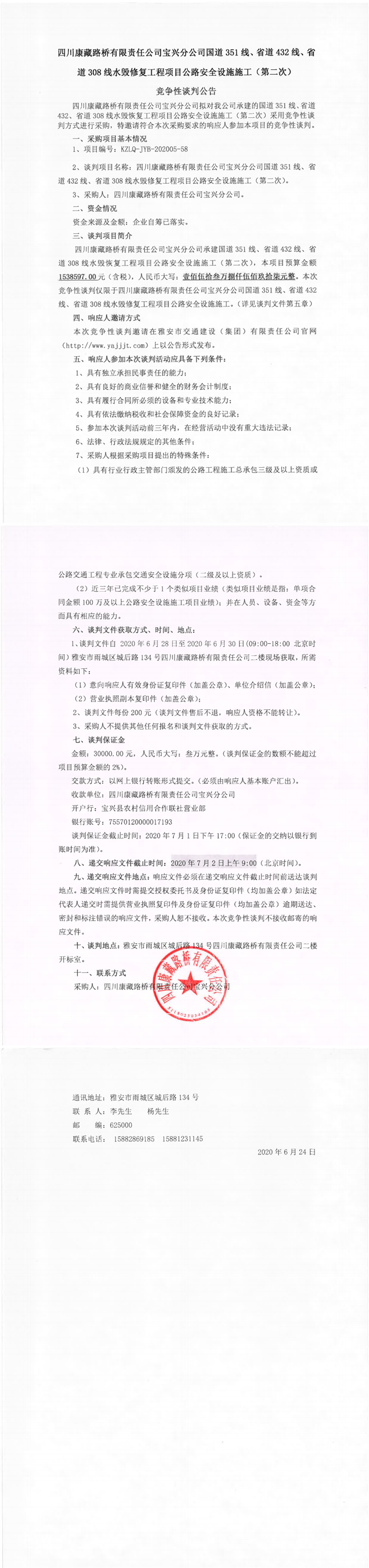 四川康藏路橋有限責(zé)任公司寶興分公司國(guó)道351線、省道432線、省道308線水毀修復(fù)工程項(xiàng)目公路安全設(shè)施施工(第二次)競(jìng)爭(zhēng)性談判公告