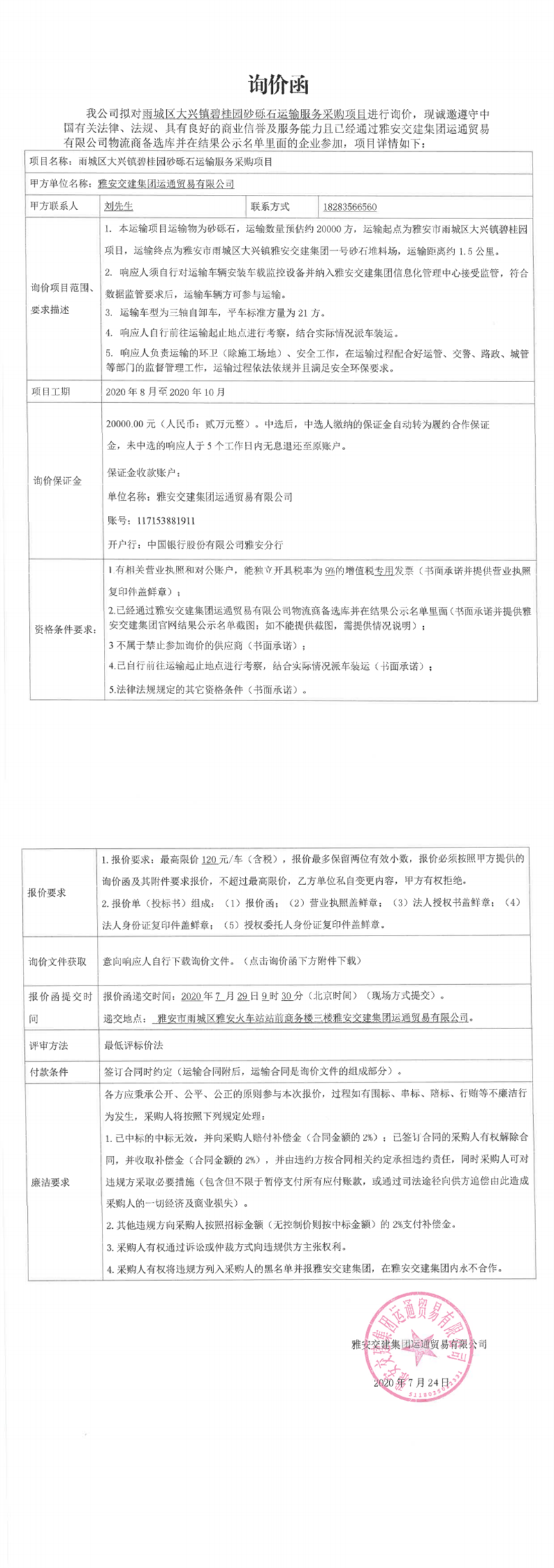 雅安交建集團(tuán)運(yùn)通貿(mào)易有限公司雨城區(qū)大興鎮(zhèn)碧桂園砂礫石運(yùn)輸服務(wù)采購項(xiàng)目詢價(jià)函