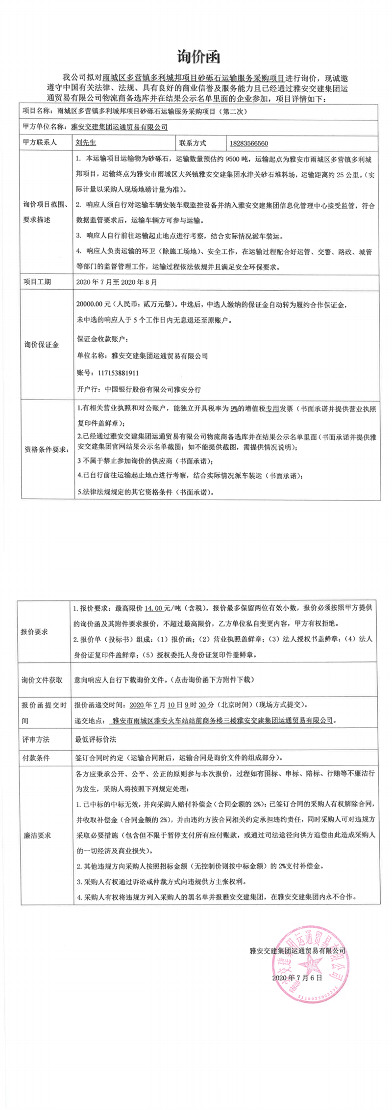 雅安交建集團(tuán)運(yùn)通貿(mào)易有限公司雨城區(qū)多營(yíng)鎮(zhèn)多利城邦項(xiàng)目砂礫石運(yùn)輸服務(wù)采購(gòu)項(xiàng)目(第二次)詢(xún)價(jià)函
