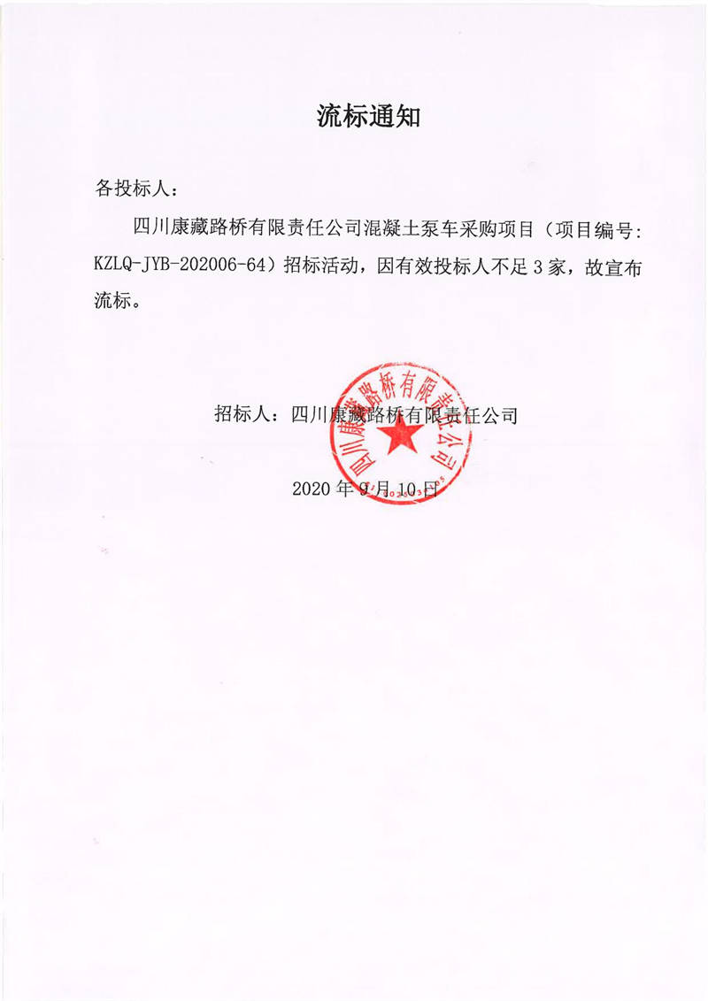四川康藏路橋有限責(zé)任公司混凝土泵車采購(gòu)項(xiàng)目流標(biāo)通知