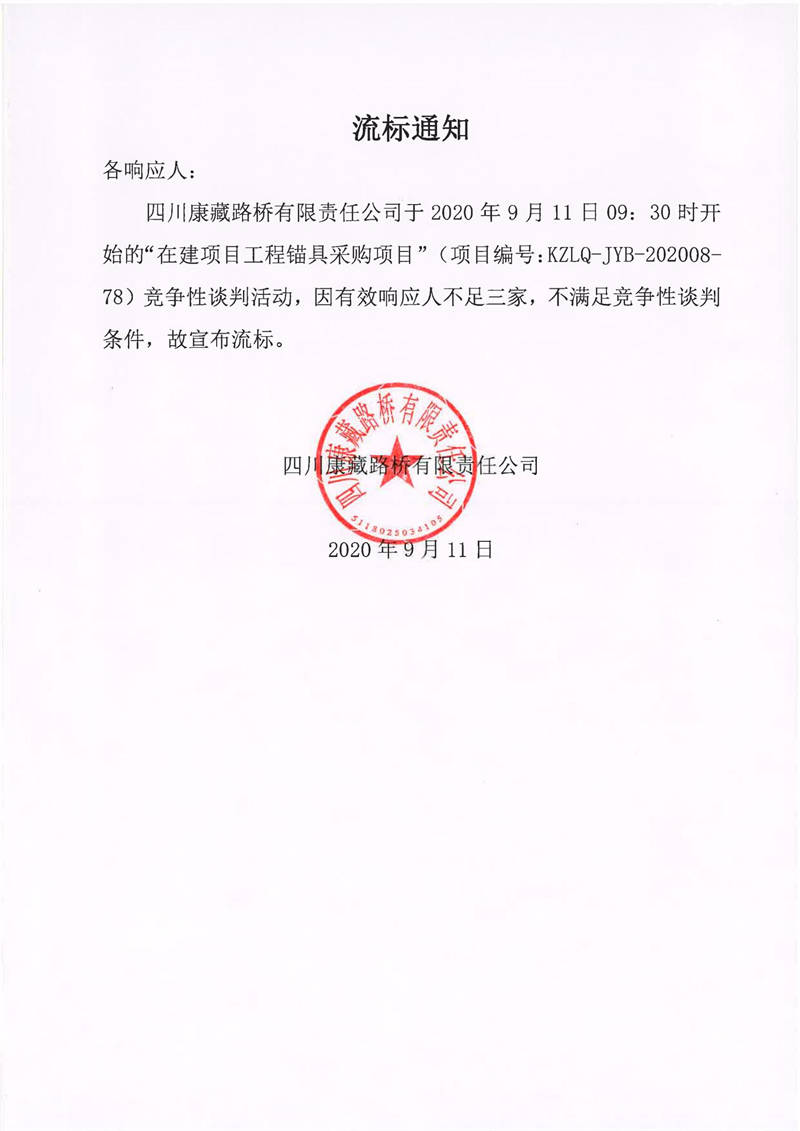 四川康藏路橋有限責(zé)任公司在建項(xiàng)目工程錨具采購競爭性談判流標(biāo)通知