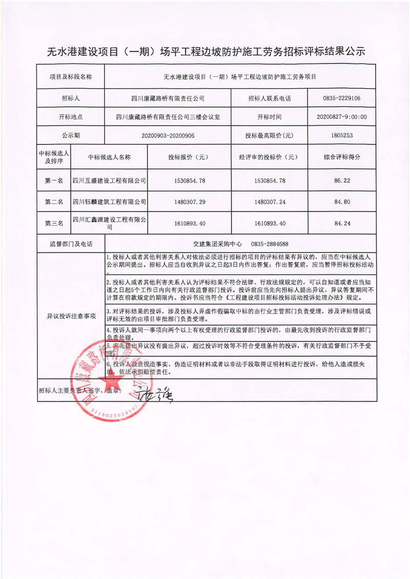 四川康藏路橋有限責(zé)任公司無水港建設(shè)項(xiàng)目(一期)場平工程邊坡防護(hù)施工勞務(wù)招標(biāo)評標(biāo)結(jié)果公示