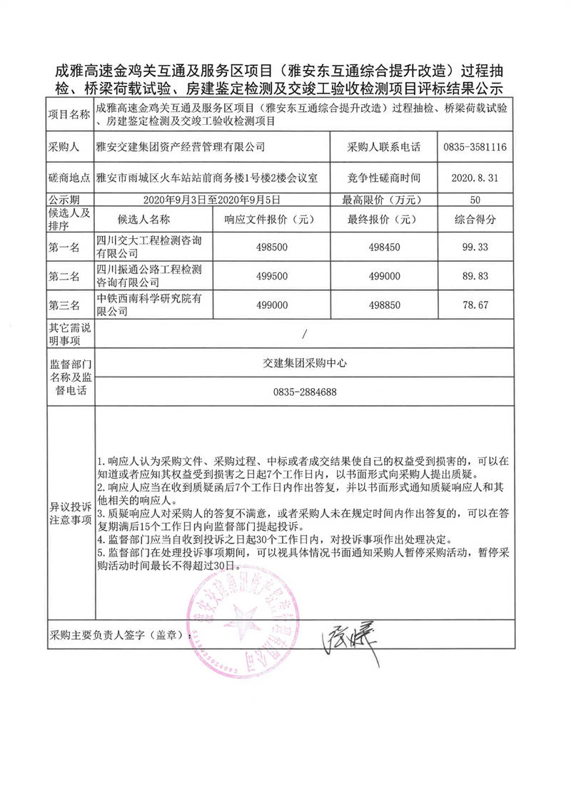 雅安交建集團資產(chǎn)經(jīng)營管理有限公司成雅高速金雞關(guān)互通及服務(wù)區(qū)項目(雅安東互通綜合提升改造)過程抽檢、橋梁荷載試驗、房建鑒定檢測及交竣工驗收檢測項目評標結(jié)果公示