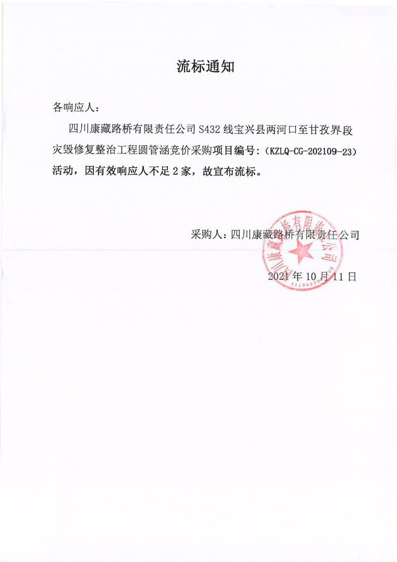 四川康藏路橋有限責任公司S432線寶興縣兩河口至甘孜界段災(zāi)毀修復整治工程圓管涵采購競價流標通知