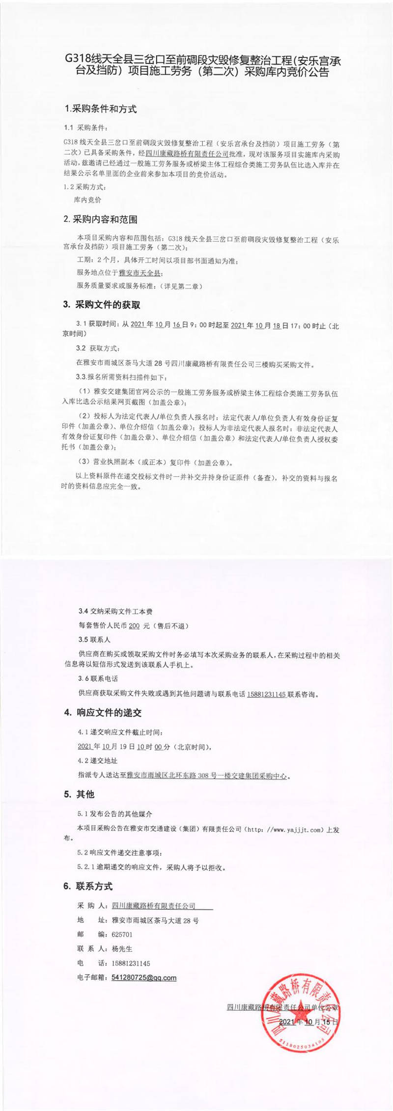 四川康藏路橋有限責(zé)任公司G318線天全縣三岔口至前碉段災(zāi)毀修復(fù)整治工程(安樂宮承臺(tái)及擋防)項(xiàng)目施工勞務(wù)(第二次)采購(gòu)庫(kù)內(nèi)競(jìng)價(jià)公告