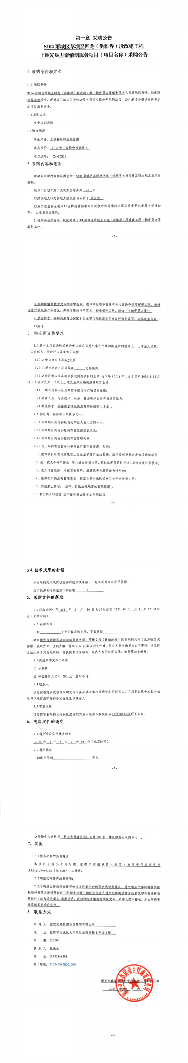 雅安交建集團(tuán)項(xiàng)目管理有限公司S104雨城區(qū)草壩至回龍(洪雅界)段改建工程土地復(fù)墾方案編制服務(wù)項(xiàng)目采購公告