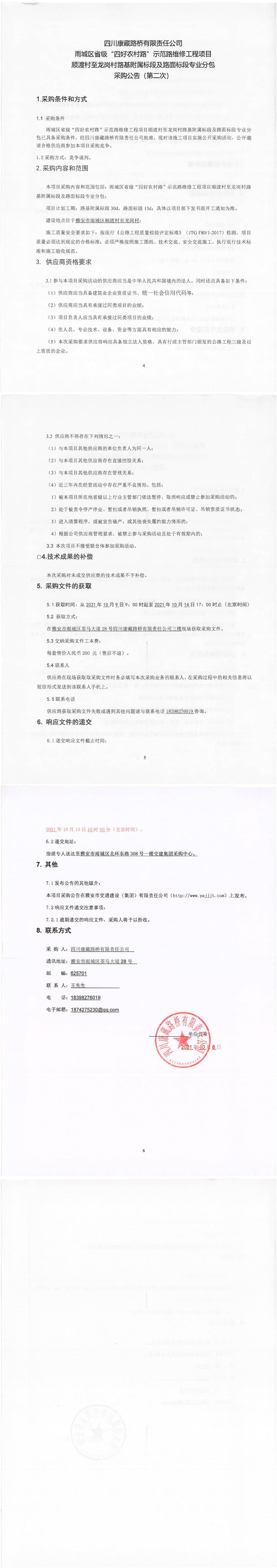 四川康藏路橋有限責(zé)任公司雨城區(qū)省級“四好農(nóng)村路”示范路維修工程項目順渡村至龍崗村路基附屬標(biāo)段及路面標(biāo)段專業(yè)分包采購公告(第二次)