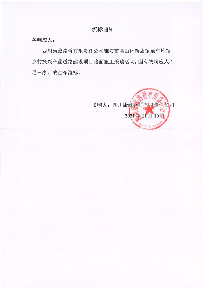 四川康藏路橋有限責(zé)任公司雅安市名山區(qū)新店鎮(zhèn)至車嶺鎮(zhèn)鄉(xiāng)村振興產(chǎn)業(yè)道路建設(shè)項目路面施工采購流標(biāo)通知