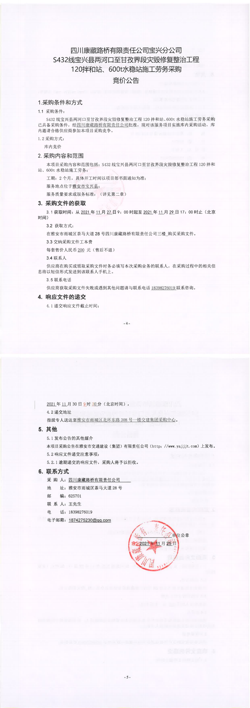 四川康藏路橋有限責任公司S432線寶興縣兩河口至甘孜界段災毀修復整治工程120拌合站、600t水穩(wěn)站施工勞務采購競價公告
