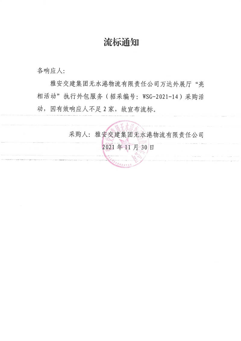 雅安交建集團(tuán)無(wú)水港物流有限責(zé)任公司萬(wàn)達(dá)外展廳“亮相活動(dòng)”執(zhí)行外包服務(wù)流標(biāo)通知