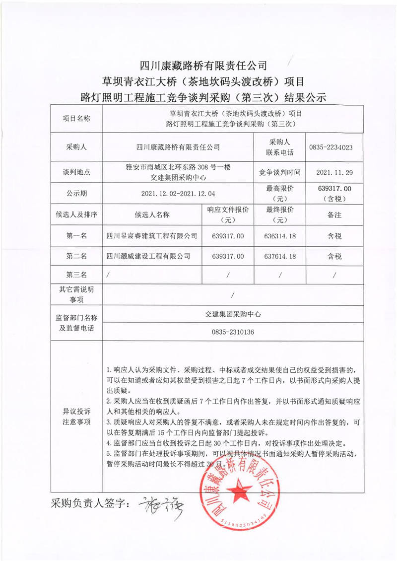 四川康藏路橋有限責(zé)任公司草壩青衣江大橋(茶地坎碼頭渡改橋)項(xiàng)目路燈照明工程施工競爭談判采購(第三次)結(jié)果公示