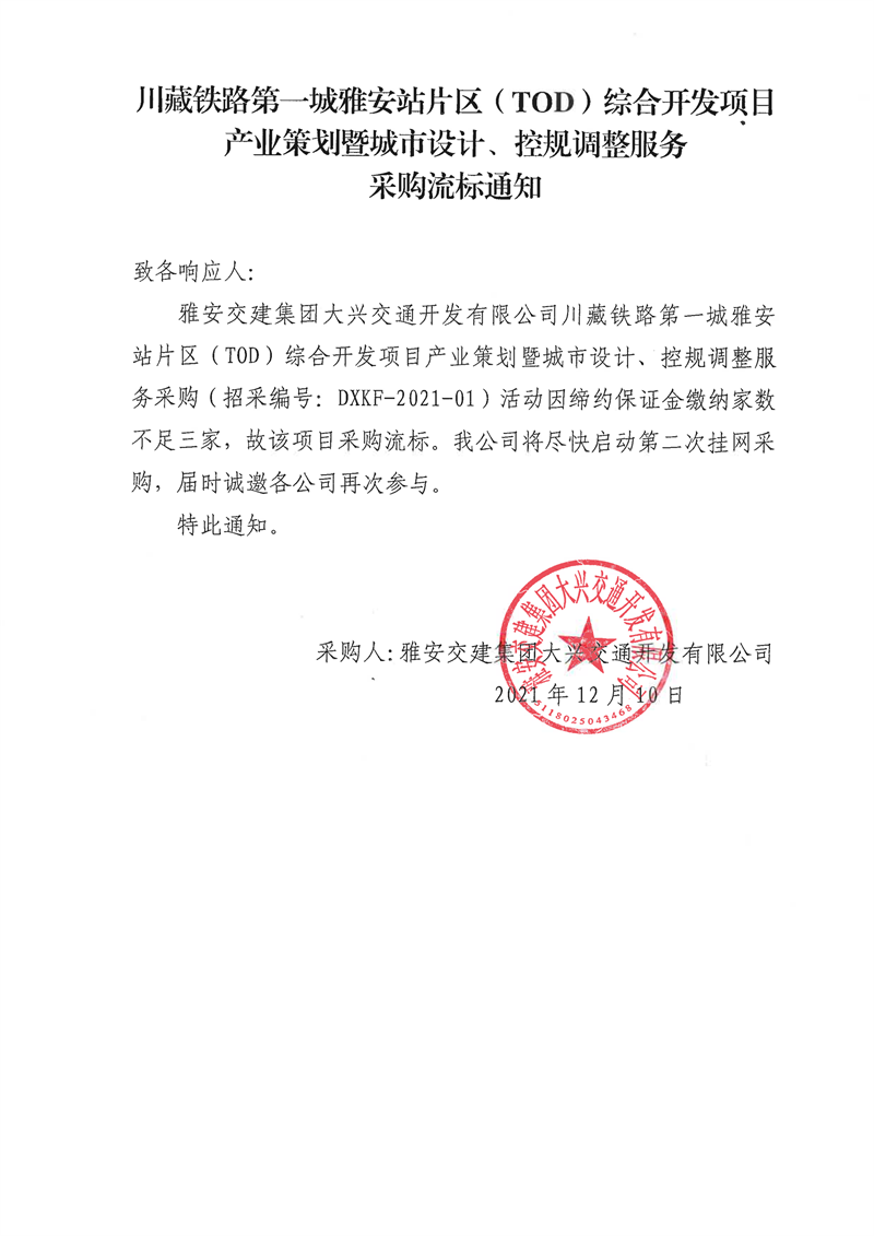 雅安交建集團(tuán)大興交通開(kāi)發(fā)有限公司川藏鐵路第一城雅安站片區(qū)(TOD)綜合開(kāi)發(fā)項(xiàng)目產(chǎn)業(yè)策劃暨城市設(shè)計(jì)、控規(guī)調(diào)整服務(wù)采購(gòu)流標(biāo)通知