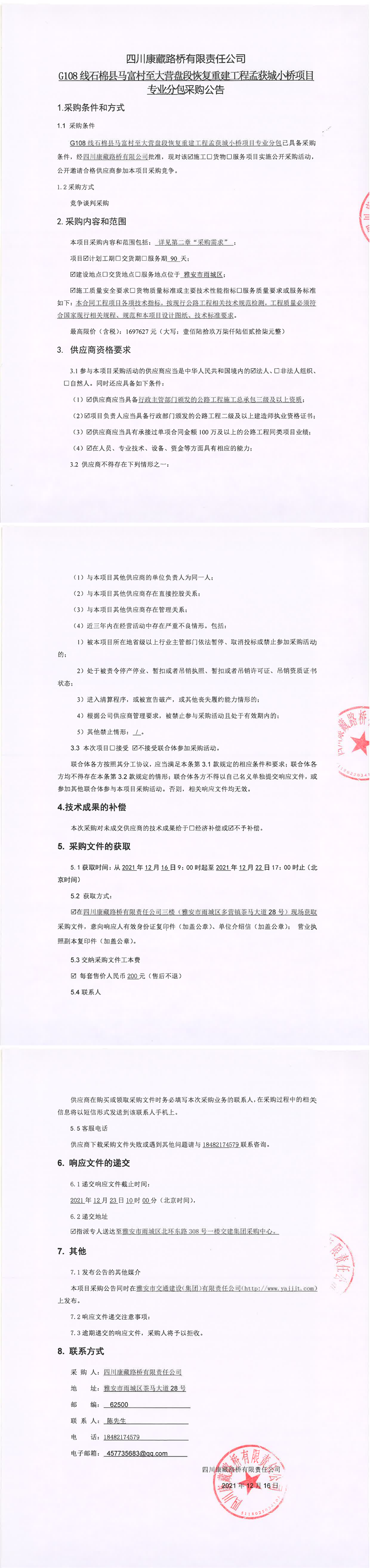 四川康藏路橋有限責(zé)任公司G108線石棉縣馬富村至大營(yíng)盤(pán)段恢復(fù)重建工程孟獲城小橋項(xiàng)目專業(yè)分包采購(gòu)公告