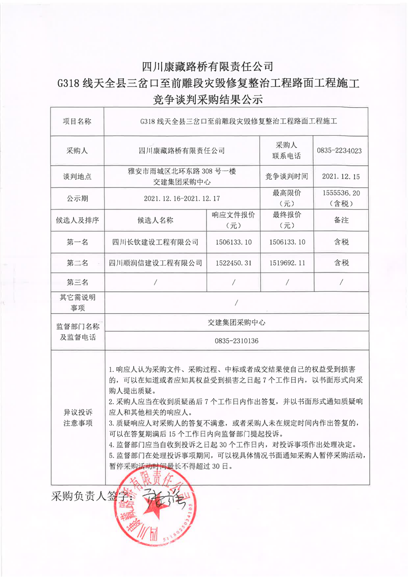 四川康藏路橋有限責任公司G318線天全縣三岔口至前碉段災毀修復整治工程路面工程施工競爭談判采購結(jié)果公示