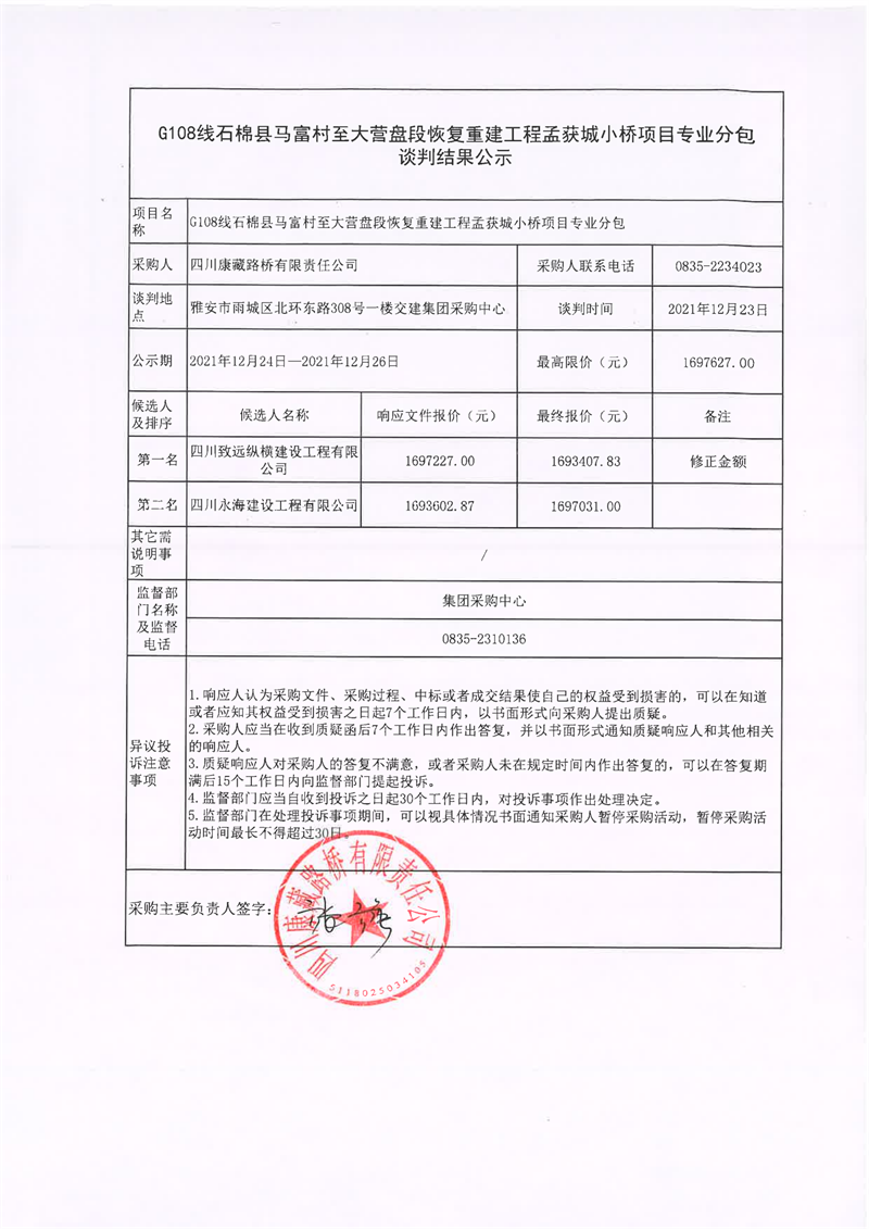 四川康藏路橋有限責任公司G108線石棉縣馬富村至大營盤段恢復重建工程孟獲城小橋項目專業(yè)分包談判結(jié)果公示