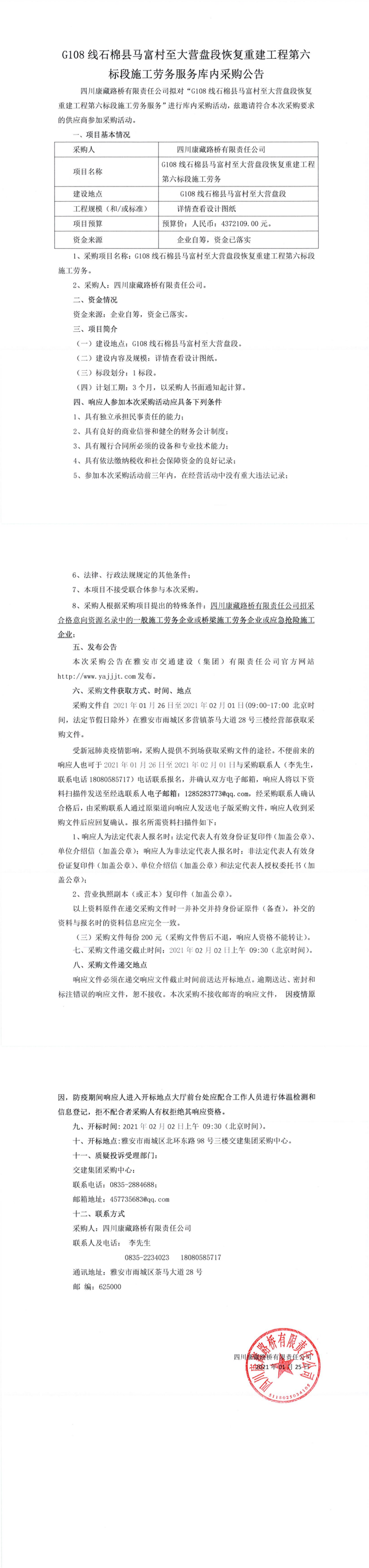 四川康藏路橋有限公司G108線石棉縣馬富村至大營(yíng)盤段恢復(fù)重建工程第六標(biāo)段施工勞務(wù)服務(wù)庫(kù)內(nèi)采購(gòu)公告
