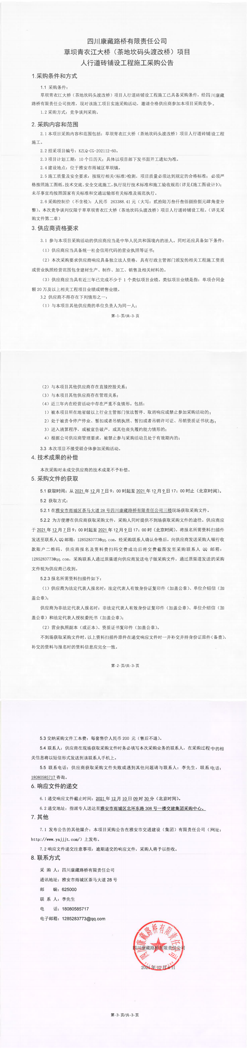 四川康藏路橋有限責(zé)任公司草壩青衣江大橋(茶地坎碼頭渡改橋)項(xiàng)目人行道磚鋪設(shè)工程施工采購(gòu)公告
